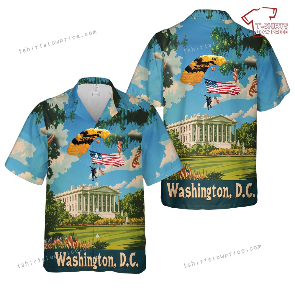 Related keywords: Golden Knights shirt, U.S. Army anniversary apparel, patriotic Hawaiian shirt, Washington D.C. landmarks shirt