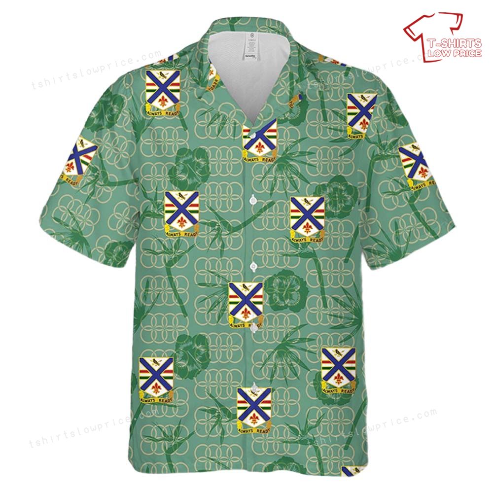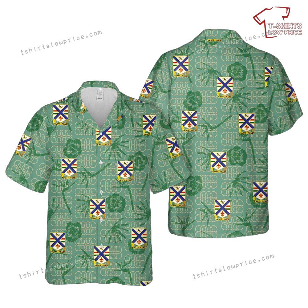 This Hawaiian shirt boldly features the insignia of the 130th Infantry Regiment, showcasing a proud crest with detailed elements that symbolize strength and honor. The lush green background is overlaid with tropical motifs, including intricate palm leaves, which add depth and vibrancy to the design. The contrast between the regiment’s emblem and the serene, lively patterns connects history, bravery, and the charm of Hawaiian aesthetics in a seamless and meaningful way. Perfect for those who appreciate military themes paired with vibrant tropical design.