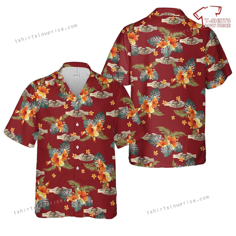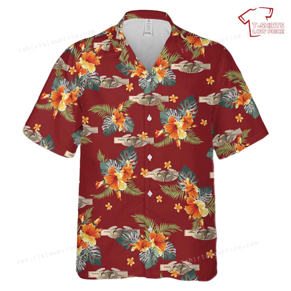 Show off your pride with this striking Hawaiian shirt that combines military honor and vibrant island vibes. Perfect for veterans, active servicemen, or fans of the airborne tradition, the design features symbolic US Army Jump Wings and the Combat Infantry Badge. These iconic symbols are seamlessly integrated into a colorful Hawaiian motif with orange hibiscus flowers and lush greenery, creating a unique blend of respect and relaxation. Make a statement wherever you go with this standout design honoring bravery and heritage.