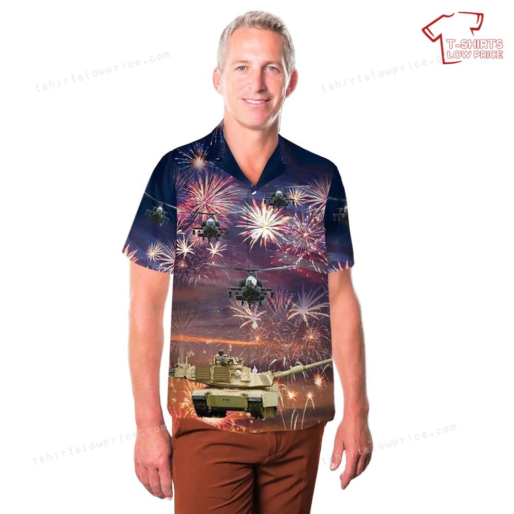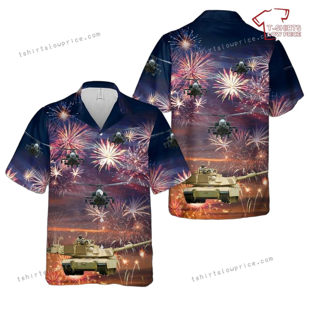 US Army M1 Abrams Main Battle Tank and a AH-64 Attack helicopter Firework Hawaiian Shirt