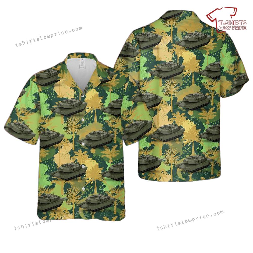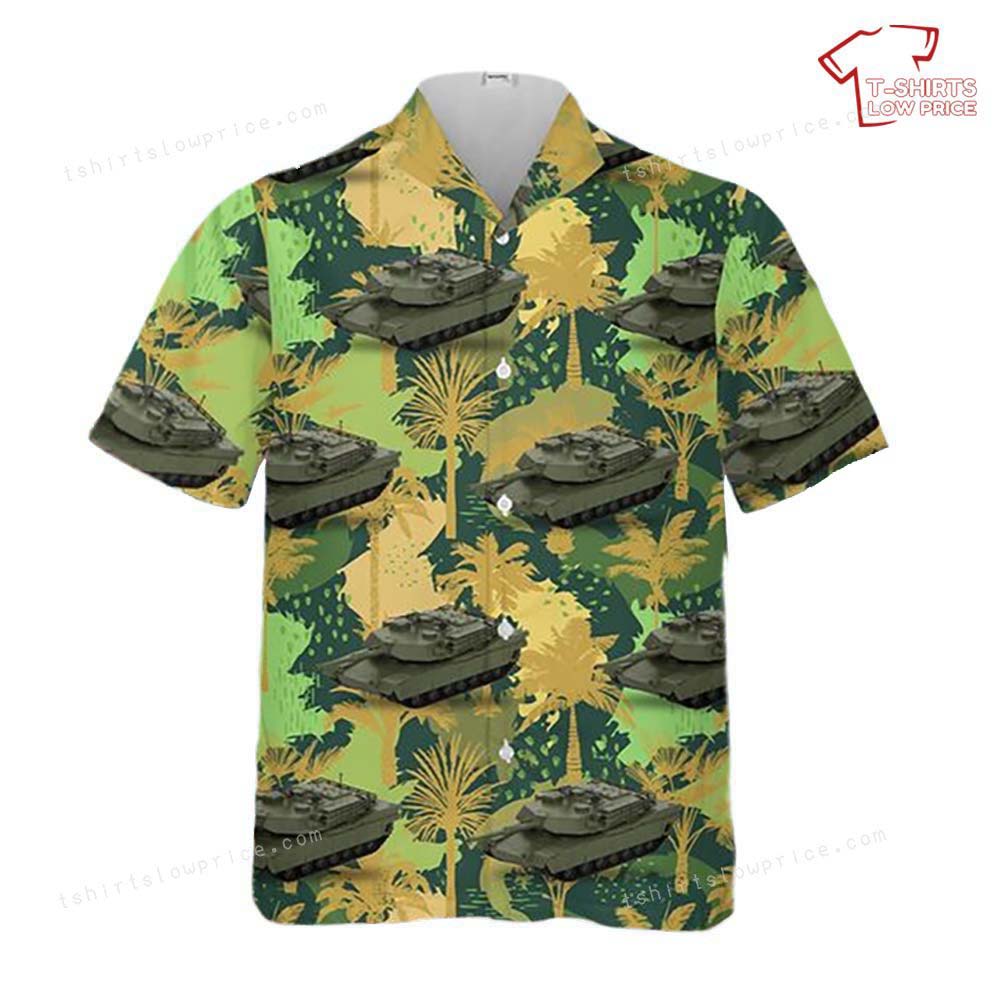 Related keywords: M1A1 Abrams tank shirt, military history apparel, tropical camouflage design, US Army Hawaiian shirt