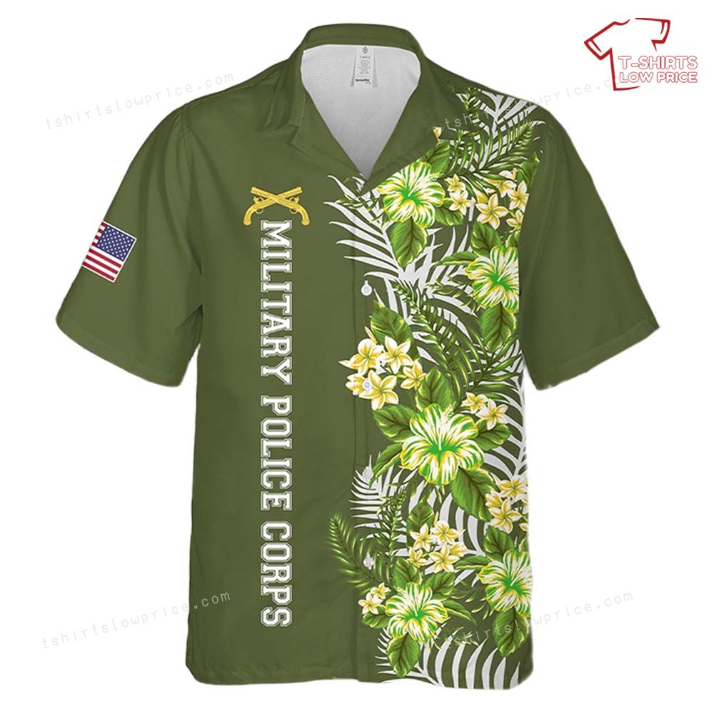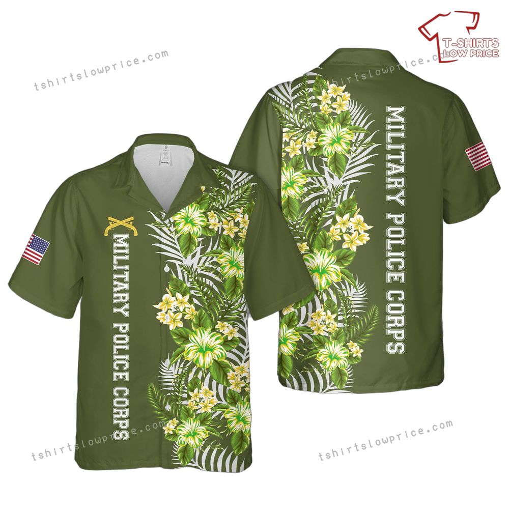 Related keywords: Military Police Corps shirt, Hawaiian military apparel, patriotic tropical clothing, US Army themed shirt.