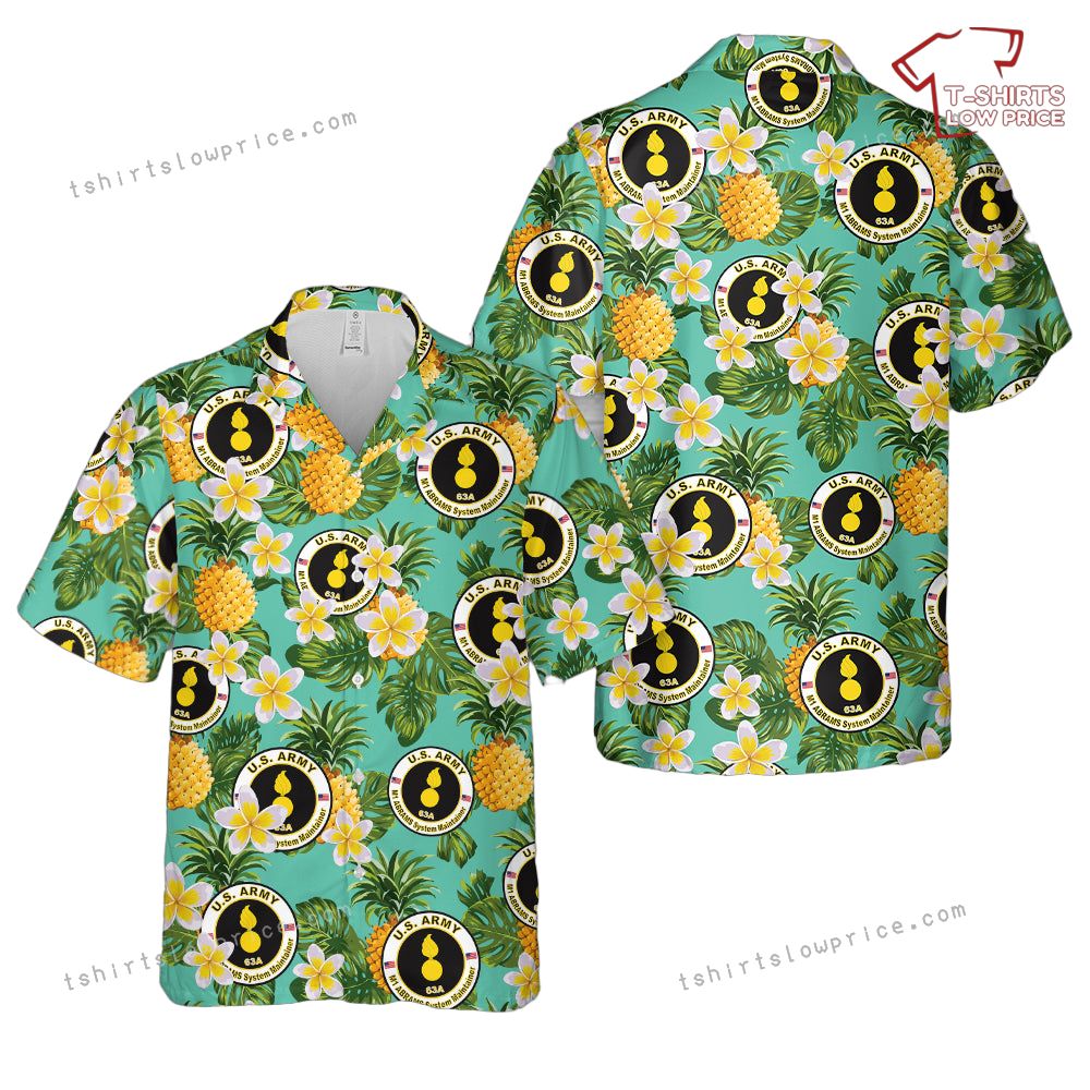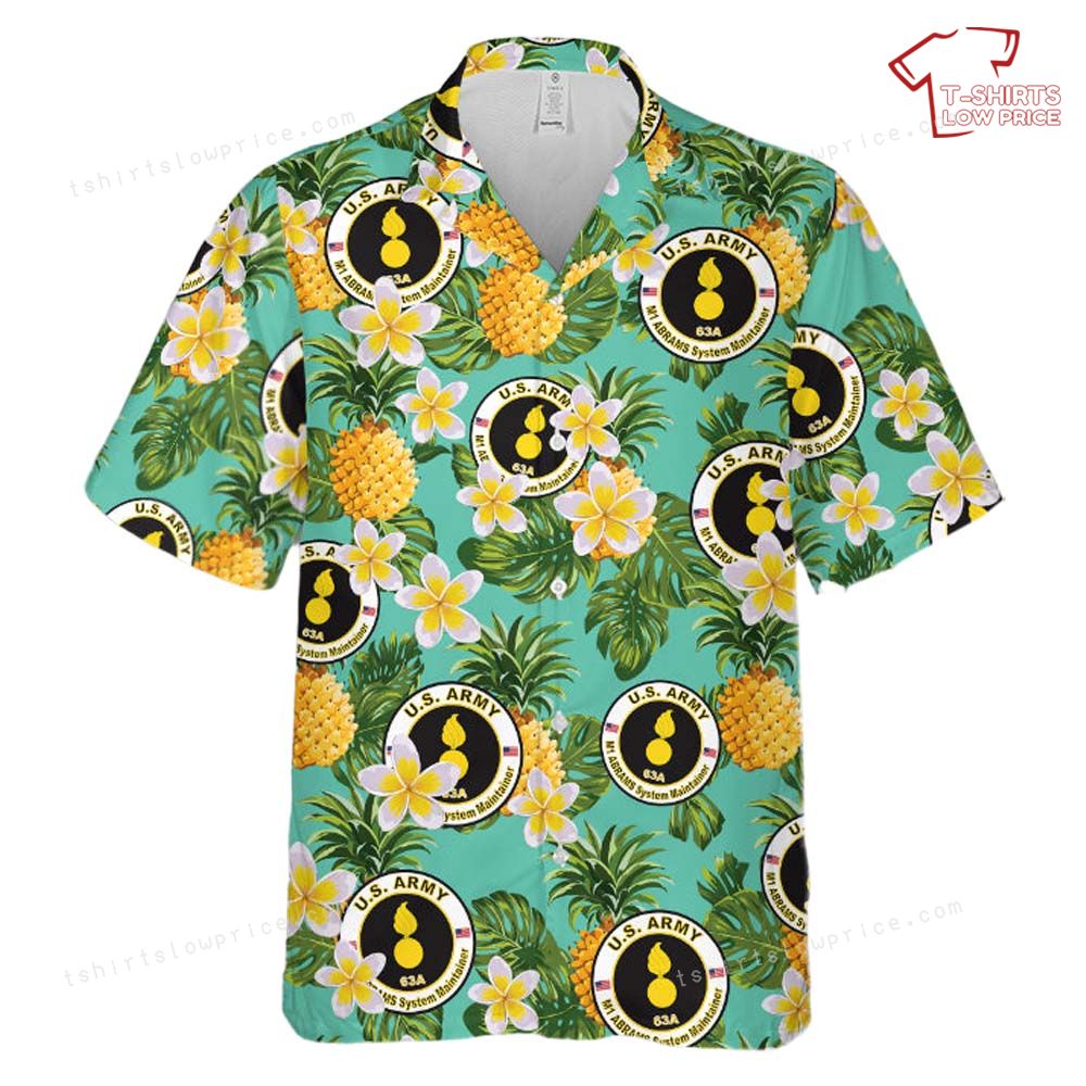 The design prominently features the U.S. Army MOS 63A emblem, a powerful symbol honoring M1 Abrams System Maintainers. The insignia is artfully interwoven with a lively tropical theme, including golden pineapples, white and yellow plumeria flowers, and rich green foliage. This combination conveys a sense of dedication and adventure, blending military heritage with the laid-back essence of Hawaiian culture. The repeating pattern adds an eye-catching dynamic, making this shirt a perfect conversation starter and an emblem of pride and relaxation.