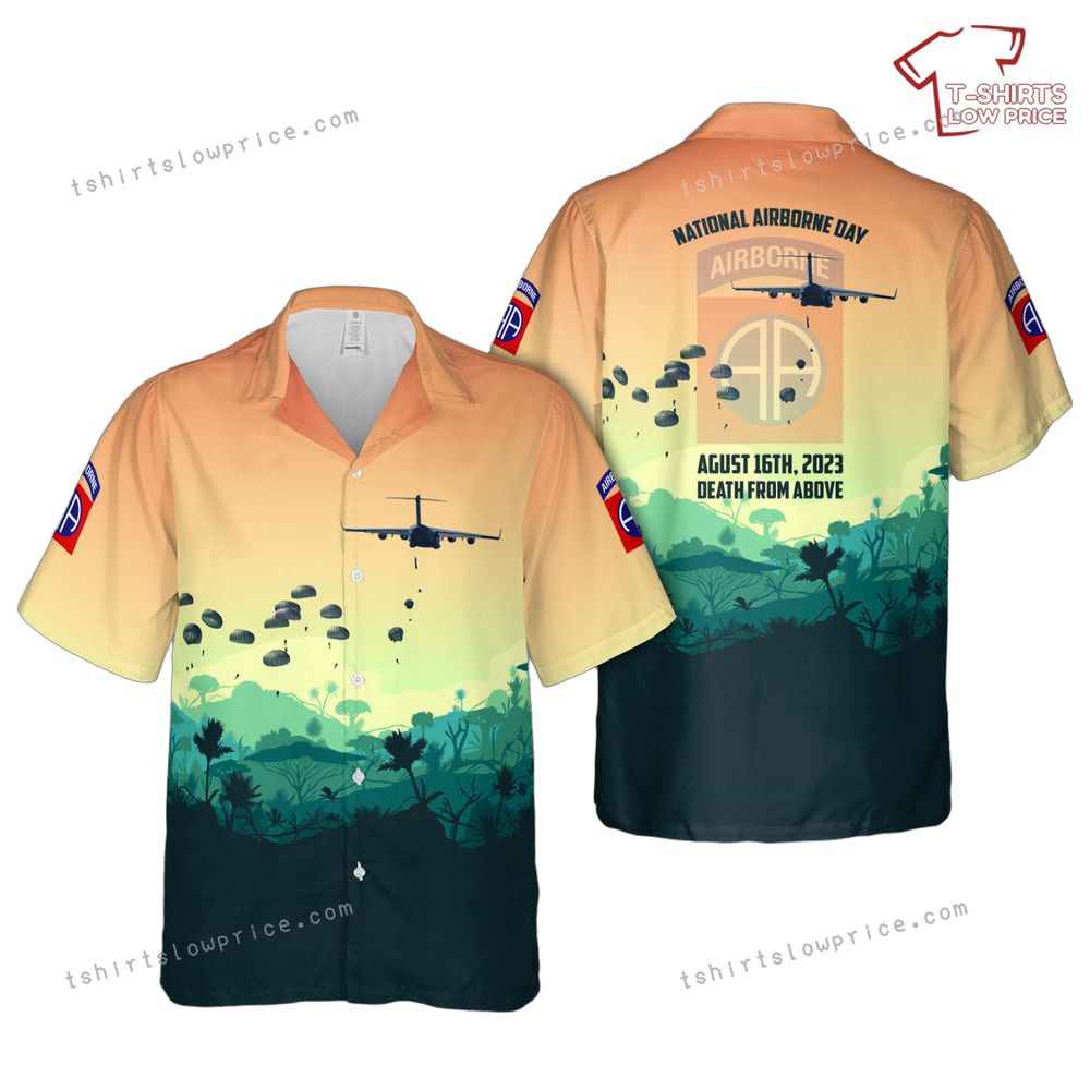 This shirt features a stunning graphic that combines the tropical serenity of a Hawaiian landscape with the dynamic imagery of airborne operations. A central airplane dropping paratroopers over a lush green jungle sets the scene, symbolizing courage and commitment. The back bears the bold text "National Airborne Day," along with the date and an inspiring motto, "Death from Above." The 82nd Airborne Division's insignia adds authenticity and honor to the design. This shirt is a masterpiece that marries art and respect for military history.