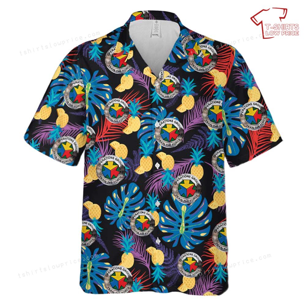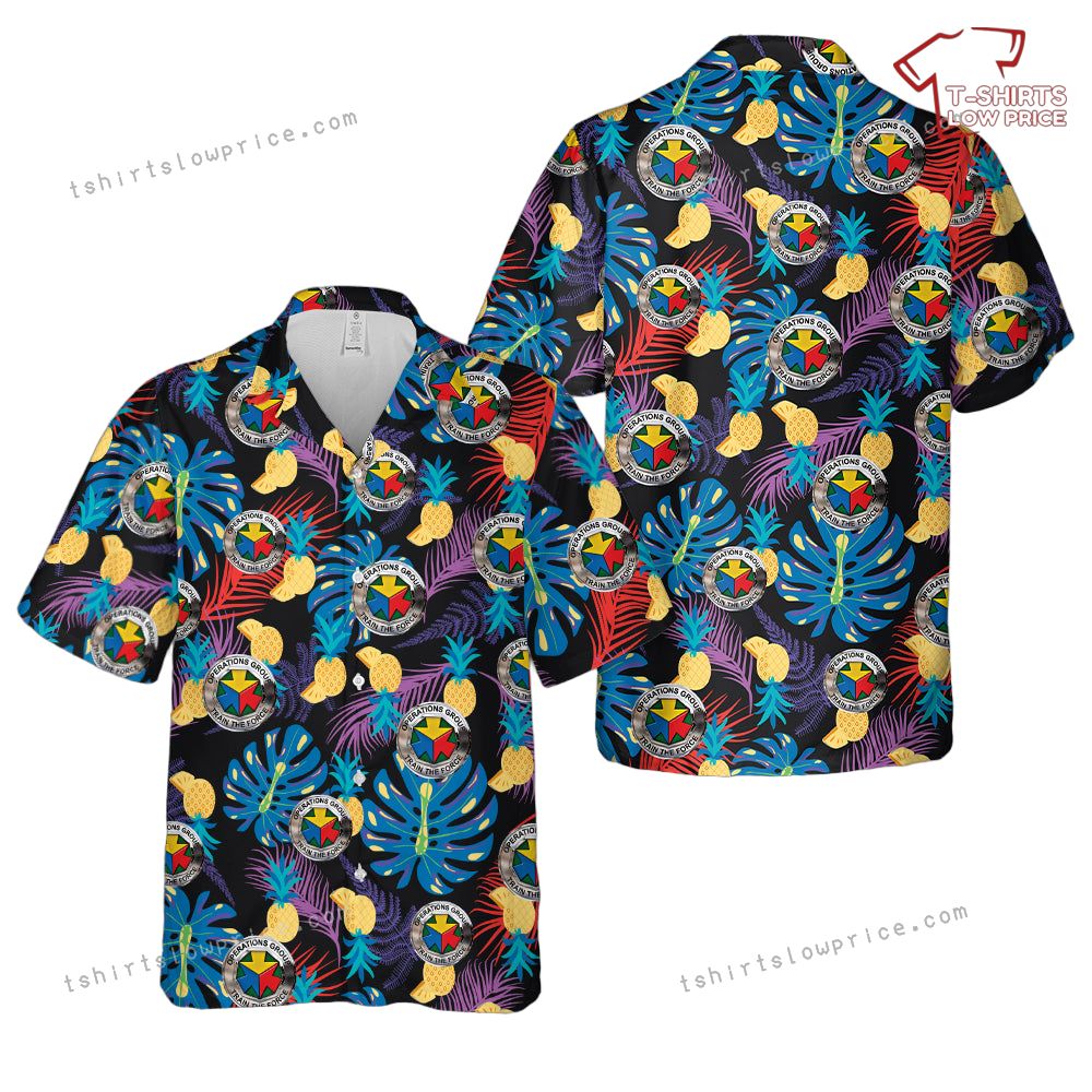 The shirt features an eye-catching graphic that intertwines elements of lush tropical foliage and pineapple motifs with the emblematic insignia of the US Army Operations Group. The insignia, prominently displayed among the lively patterns, adds a historical and authoritative touch to the overall design. The juxtaposition of military symbolism with vibrant Hawaiian aesthetics creates a unique narrative of strength and leisure. Each element within the graphic complements the other, weaving a story of unity between nature and the valor of military service. This shirt is more than just attire; it’s a tribute to those who serve and the beauty of the places they protect.